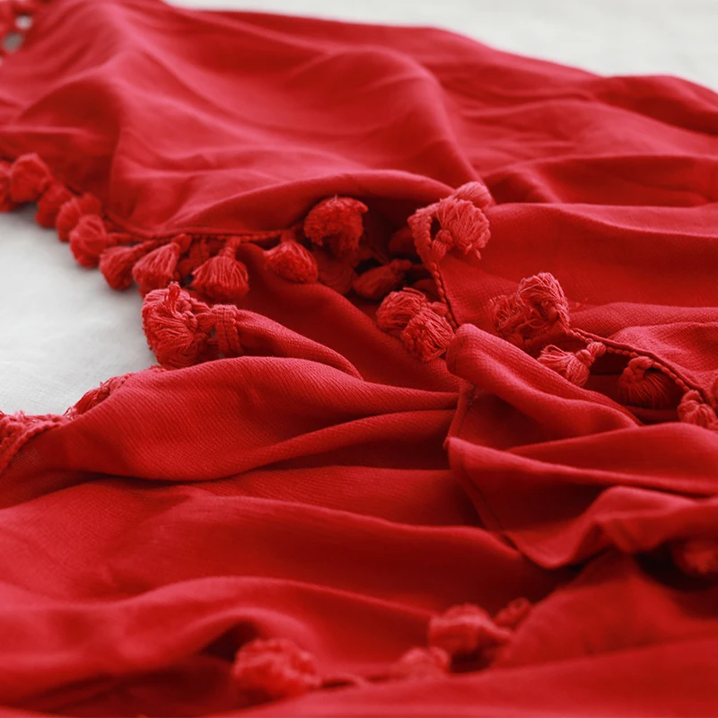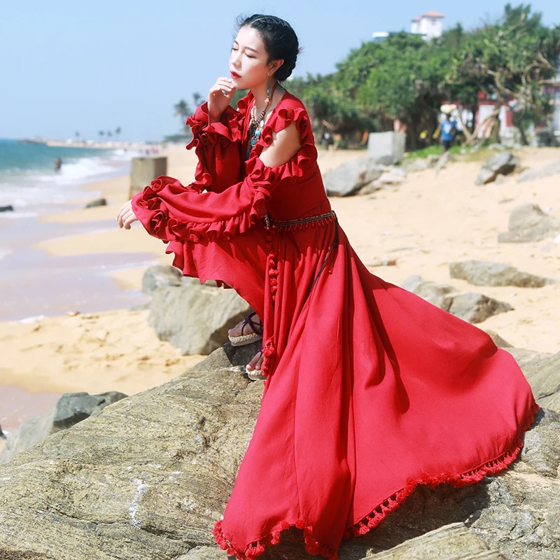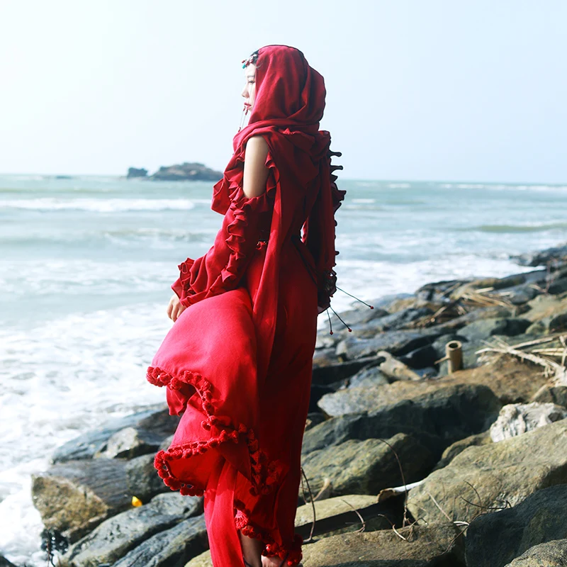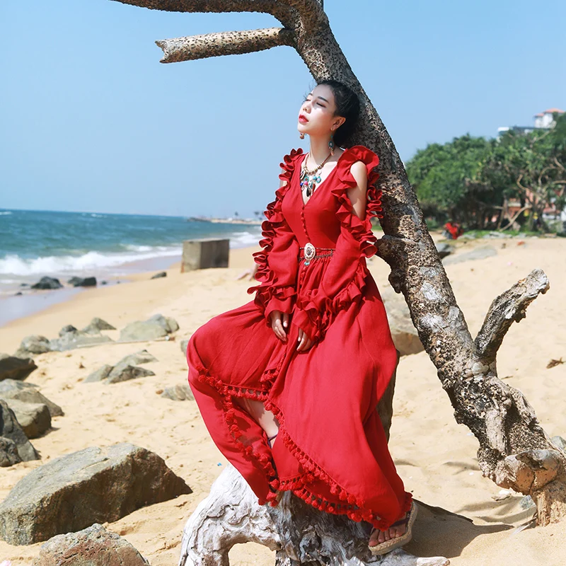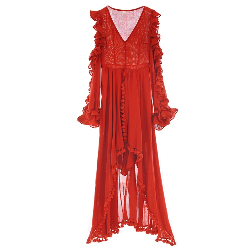 Images of Free Shipping Red Spring Summer New Fashion Linen Cotton Irregular High-low Women Long Sleeve Maxi V-neck Dresses With Tassels :