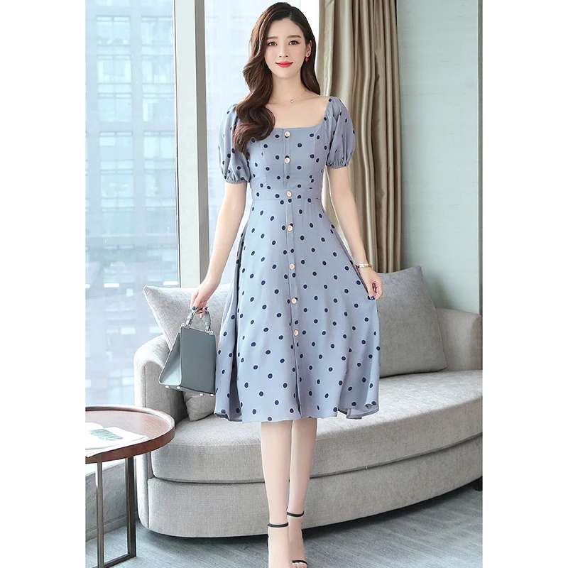 Promo Midi Slim Polka Dot Women Dress High Waist Elegant Korean Yellow Dress Vintage Office Casual Party Blue Dress Runway 2020 New
