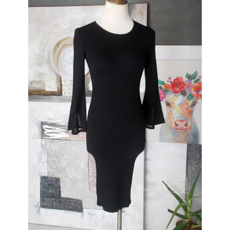 Images of YUNINYOYO A sotf woman knitting dress writh a formfitting sihouette 3/4 sleeves with flared cuffs spring summer dress :