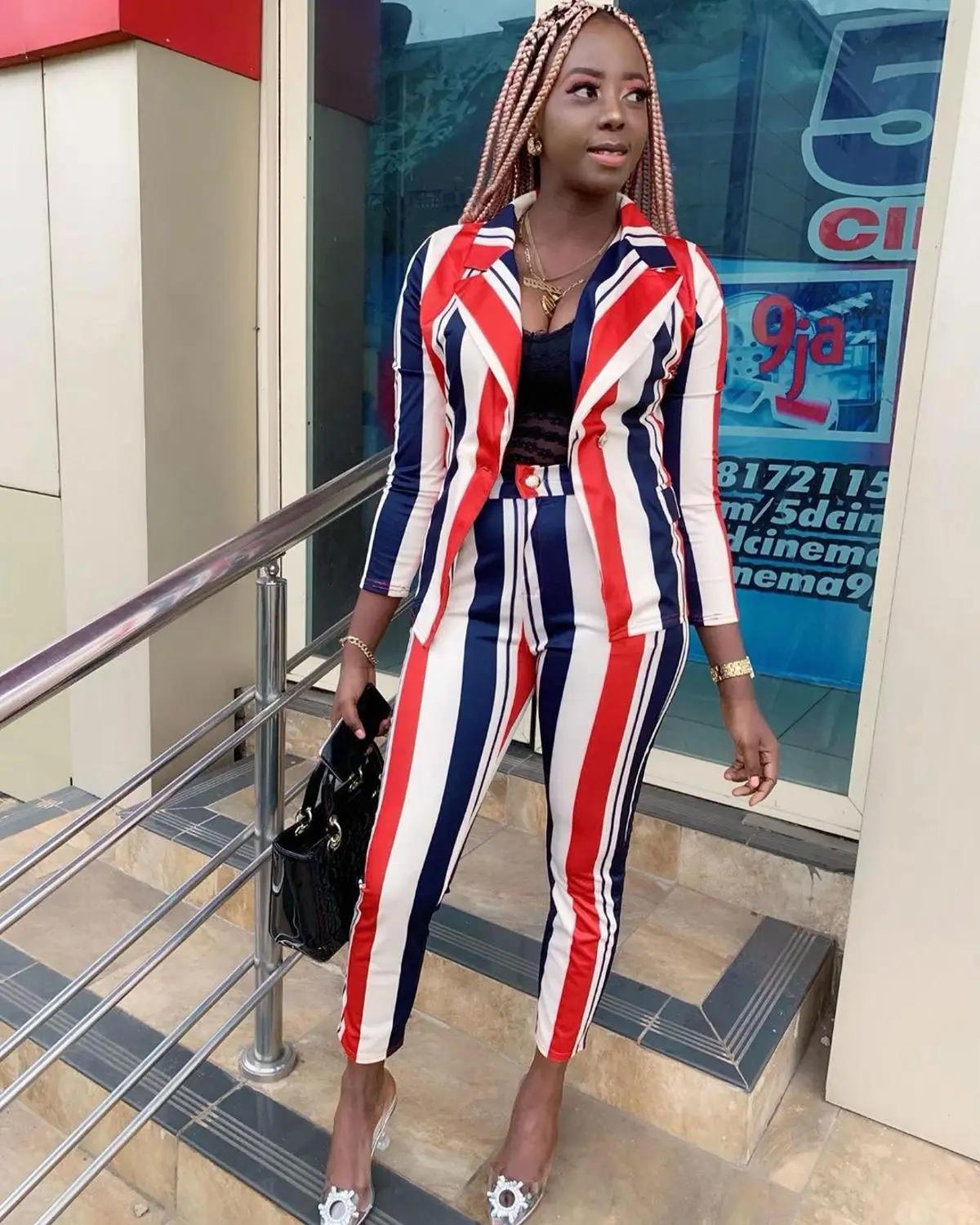 Images of 2020 New Spring Women Sexy Classic Striped Full Sleeve Blazer Top Long Pencil Pants High Rise Leisure ladies suit 2 Piece Set :