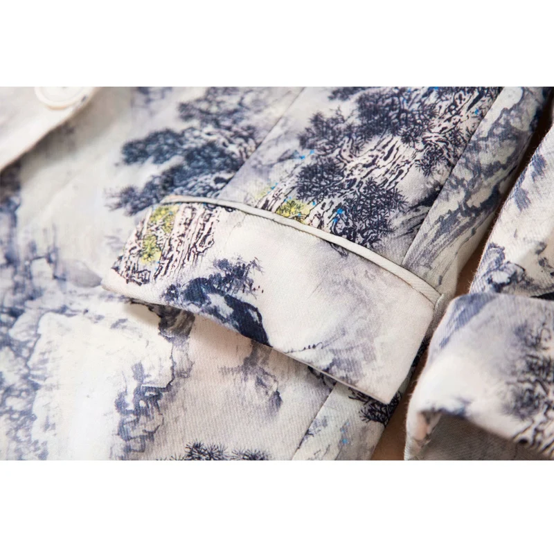 Images of SEQINYY Short Jacket 2020 Summer Spring New Fashion Design 3/4 Sleeve Ink Forest Printed Thin Casual Women Linen Blazer :