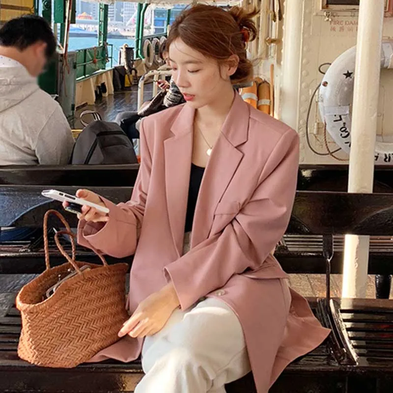 Best Offer New Spring Autumn Fashion Casual Single Breasted Pocket Solid Blazers Elegant Office Fresh Outwear Pink Blazer Plus Size oversiz