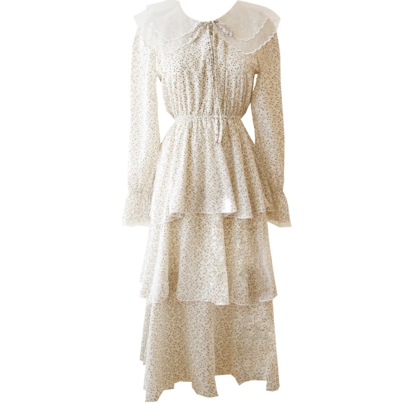 Images of 2020 Spring Chiffon Floral Cupcake Peter Pan Collar A-Line Dress Empire Elegant Women Flare LongSleeve Dress Party Vestidos :