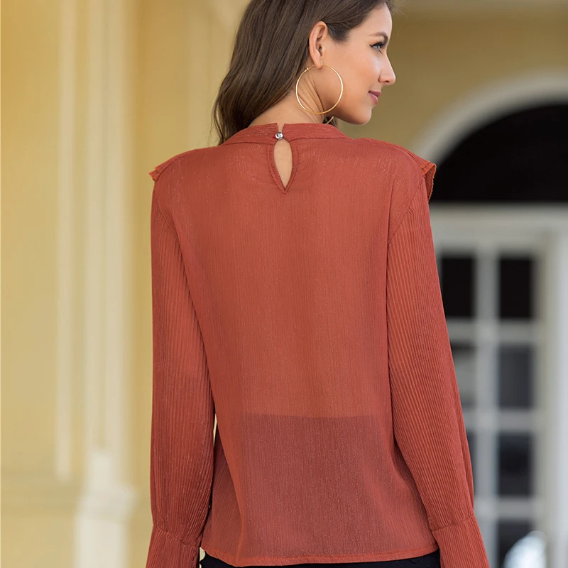Images of Fashion Red Blouse Women Ruffles Long Flare Sleeve Ruched Shirt Simple Spring Summer Chiffon Tops Clothes Blusa Feminina 2020 :
