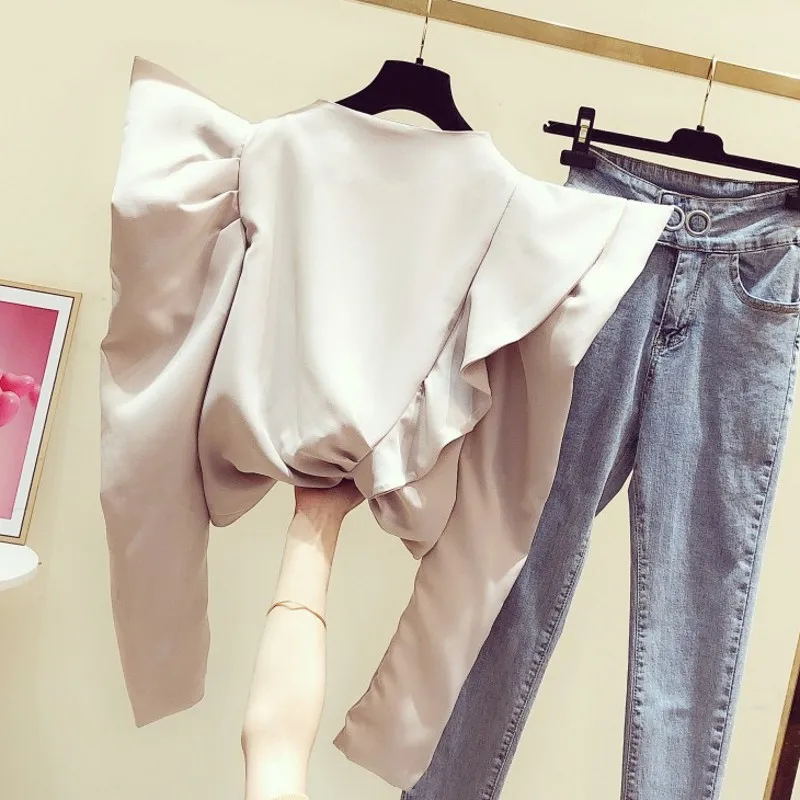 Sale womens blouses and tops 2020 Spring New Korean Fashion Temperament Satin Ruched Waist Puff Sleeve Shirt Ruffles Blouses ladies