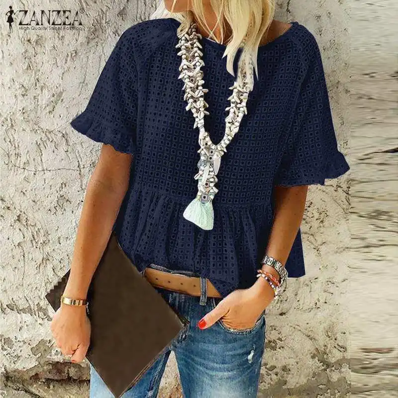 Images of 2020 ZANZEA Elegant Women's Lace Blouse Hollow Out Summer Tops Short Sleeve Shirts Female O Neck Casual Blusas Plus Size Top 5XL :