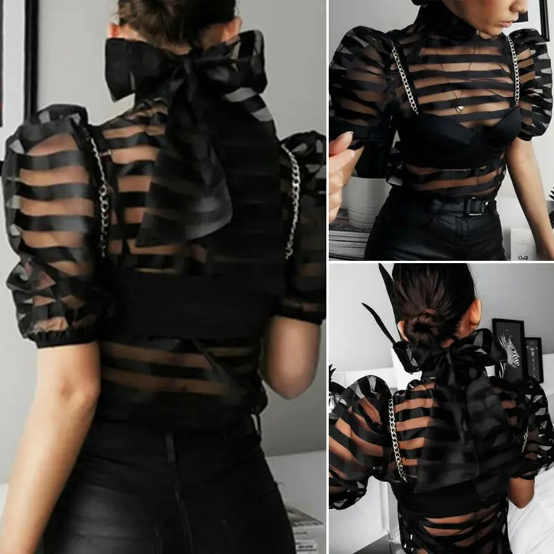 Best Offer Women Turtleneck Mesh See Through Tops Back Bowtie Striped Shirt Blouse Sexy Classy Party Clubwear Sexy Chic Streetwear Shirts