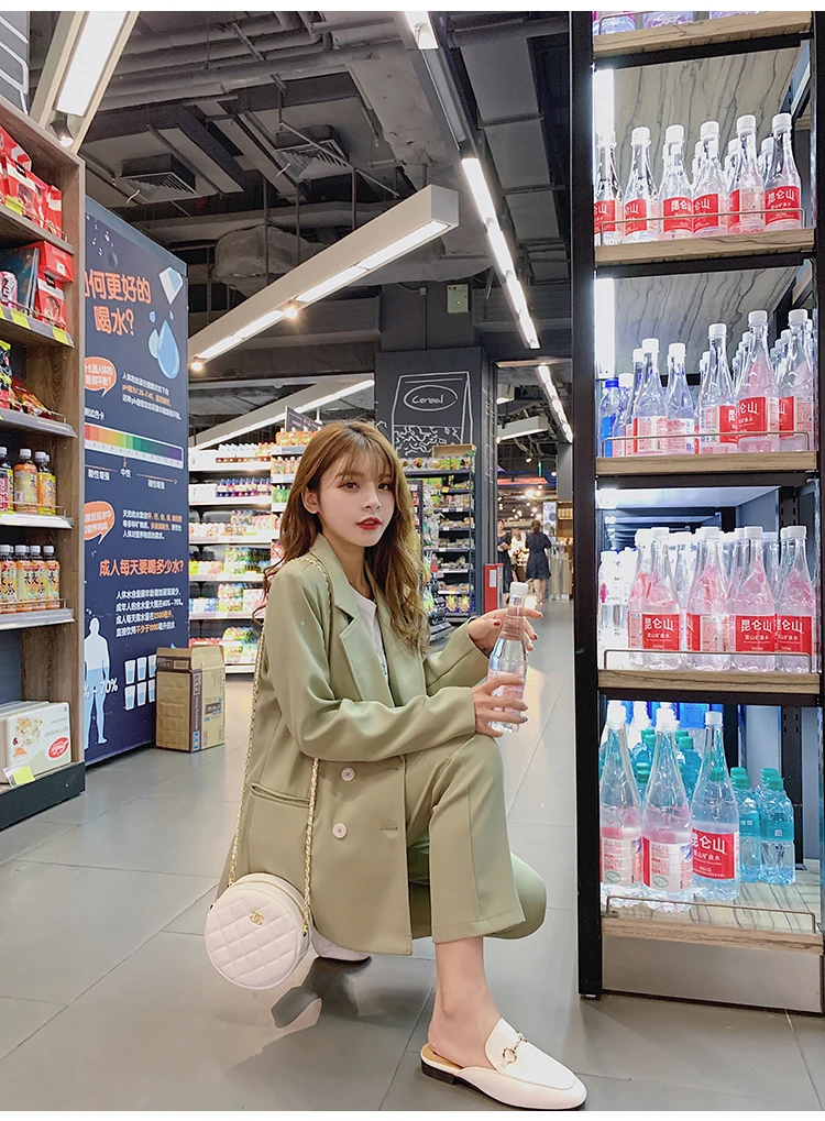 Images of Blazer Jacket & Pant Vintage Autumn Winter Thicken Women Pant Suit Light Green Notched Office Wear Women Suits Female Sets :
