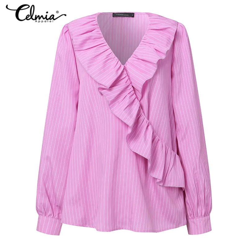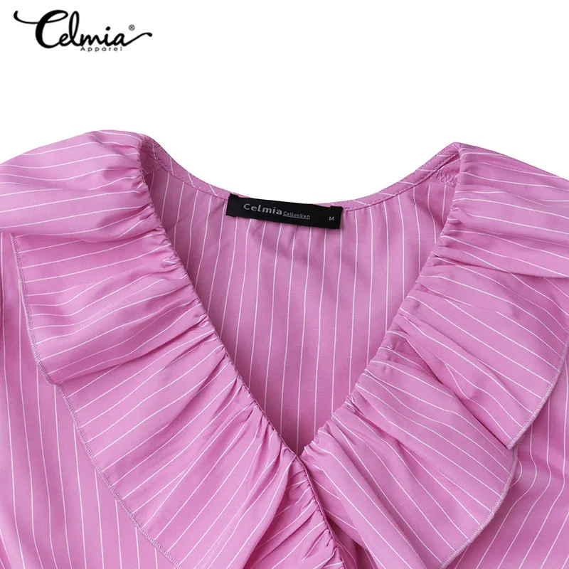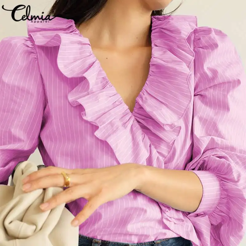 New Celmia Top Fashion Women Ruffles Blouse Ladies Sexy V-neck Striped Shirt Long Lantern Sleeve Elegant OL Blusas Mujer Plus Size