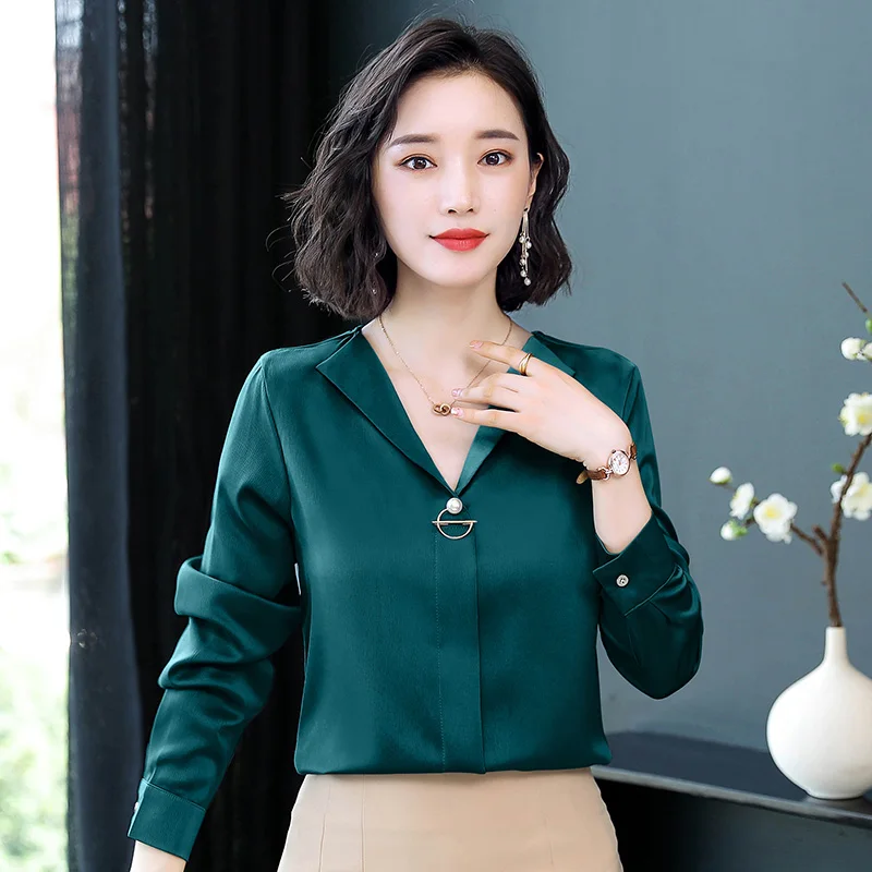 Images of Satin Solid Blouse Women Long Sleeve V-neck Ladies Elegant Tops Female White Blue Pink Shirt Woman Temperament Work Clothes :