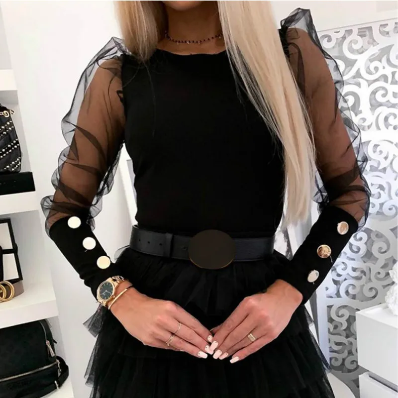 Sale Women Ladies Mesh Puff Sheer Sleeve Knitted Blouse Fashion Women Solid Color Top