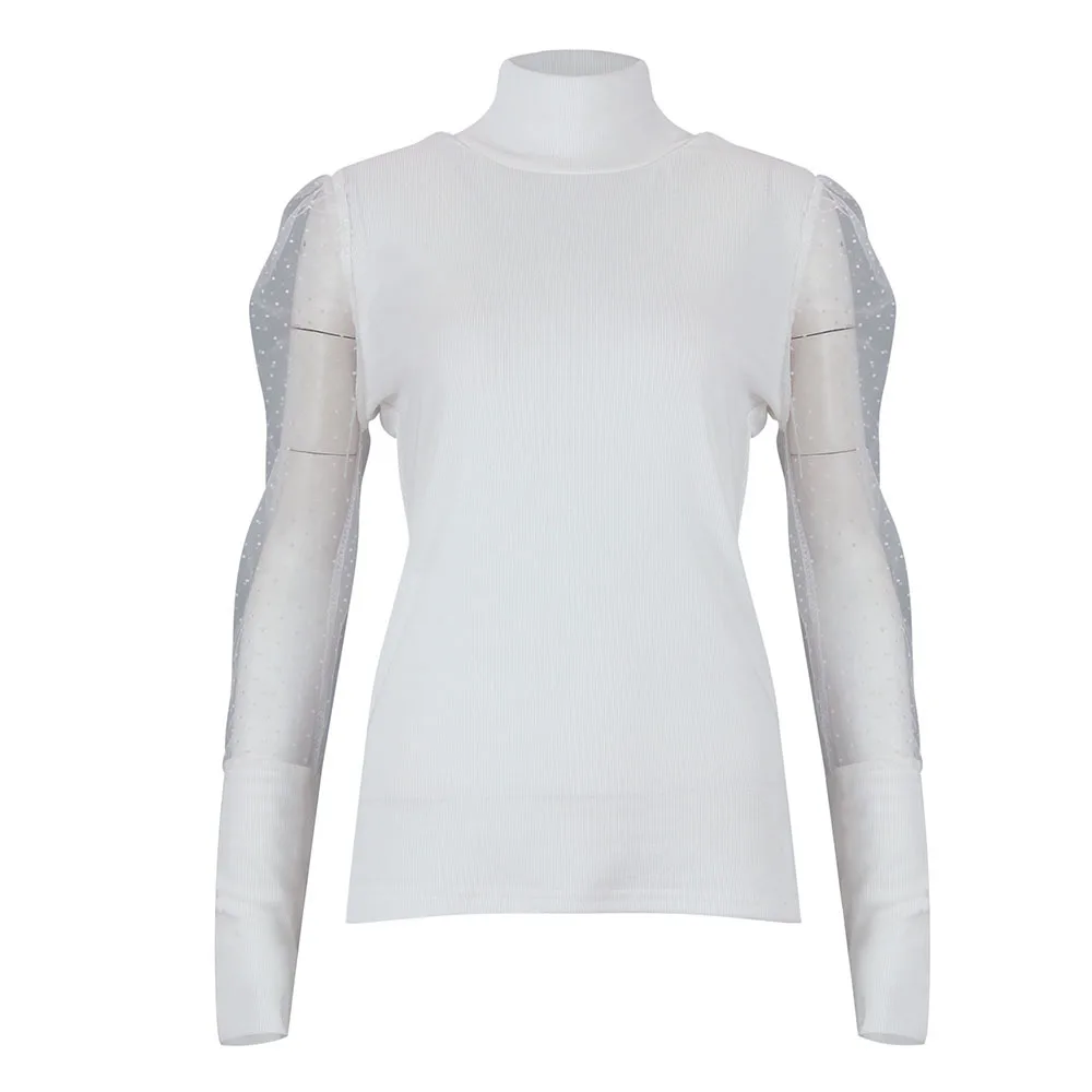 Best Offer Fall Clothing Sexy Women Blouse Turtleneck Polka Dot Puff Sleeve Skinny Long Sleeve Casual Long Sleeve Tops and Shirt
