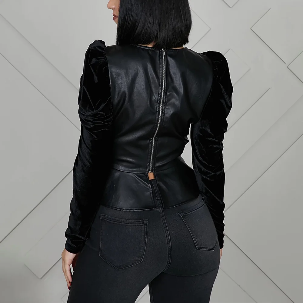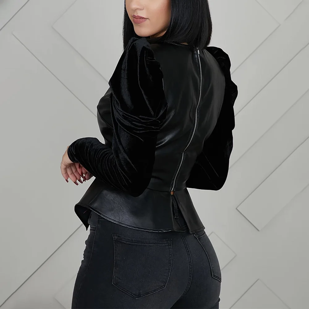 Images of Ladies Black Short Loose Pu Leather Jacket Autumn Winter Puff Sleeve Biker Jacket With Back Zipper Street Casual Outerwear D30 :