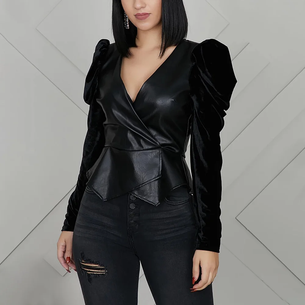 Best Offer Ladies Black Short Loose Pu Leather Jacket Autumn Winter Puff Sleeve Biker Jacket With Back Zipper Street Casual Outerwear D30