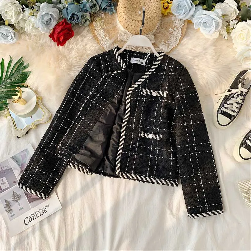 Images of Fashion black white patchwork tweed woolen coat women 2019 autumn korean clothing pearl buttons vintage female jackets & coats :