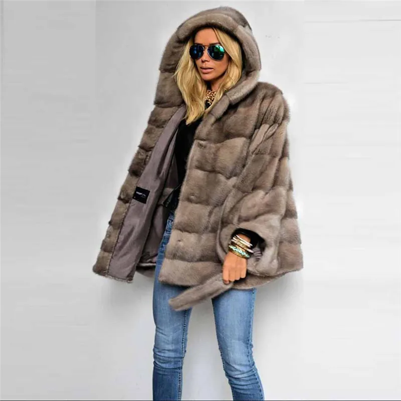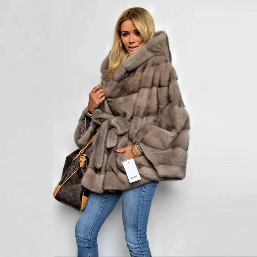 Images of 2019 Women Real Mink Fur Coat With Hood Bat Sleeve Natural Full Pelt Genuine Mink Fur Jacket With Belt Luxury Winter Overcoats :