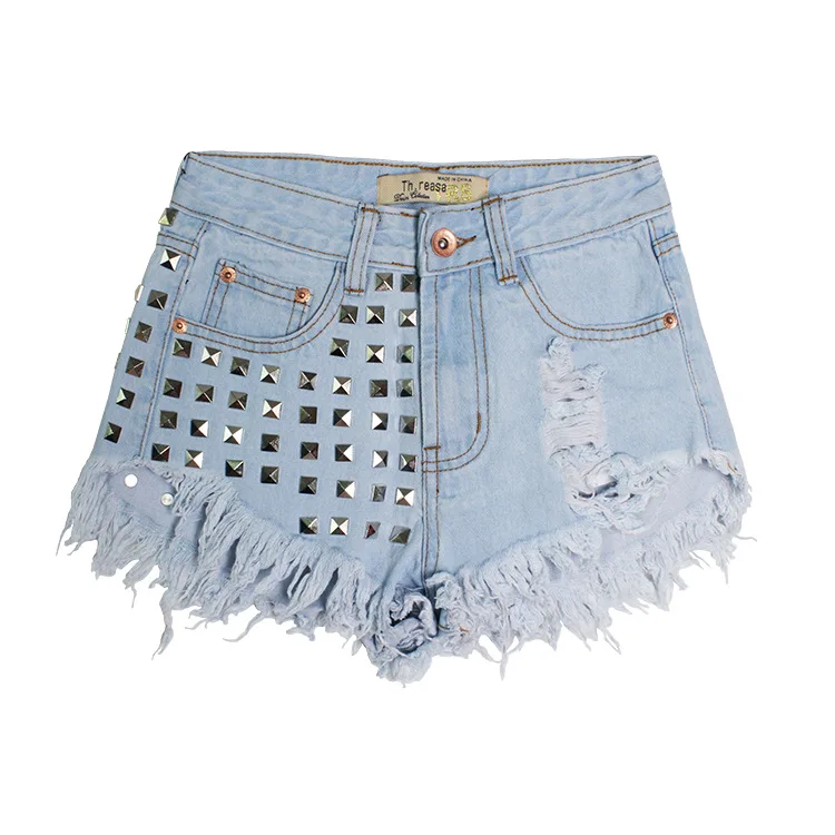 Promo Europe and America Hot Sale Explosion Style Women's Hole Studded Denim High Waist Shorts Hot Pants