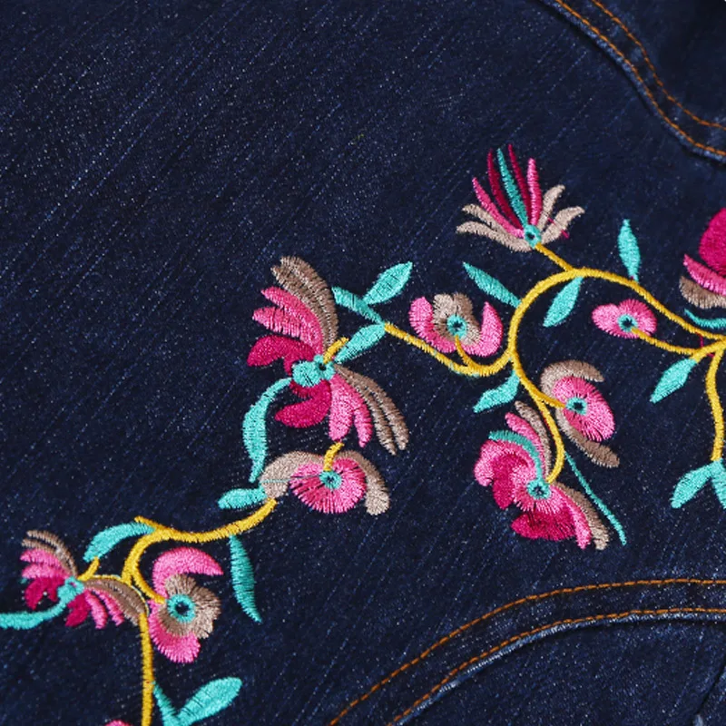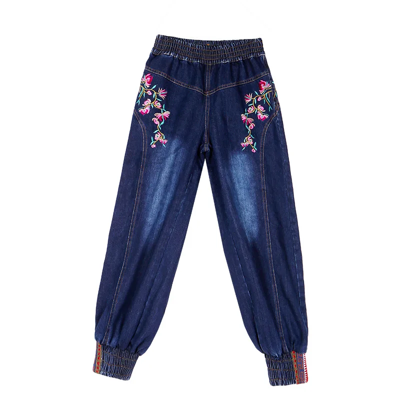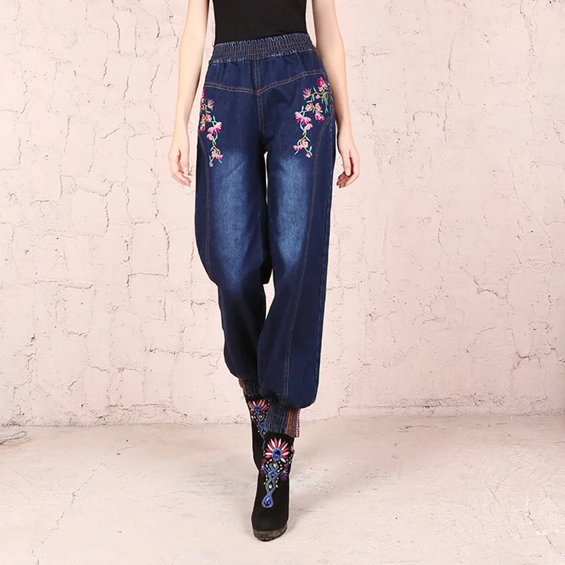 Sale Free Shipping 2019 New Vintage Long Pants For Women Embroidery Flower Trousers Plus Size M-XL Denim Jeans Elastic Waist Casual