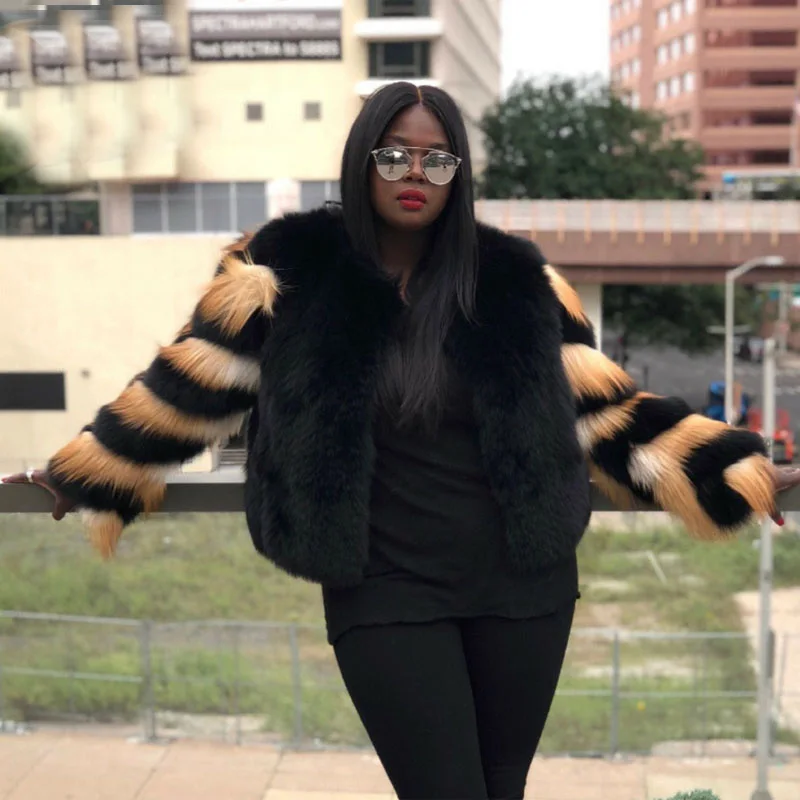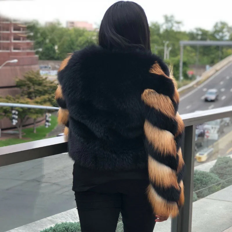 Images of Black Fashion Short Real Fox Fur Coat Women Winter Sleeve Stitching Red Fox Fur Luxury Overcoats High Quality Fur Coats Woman :