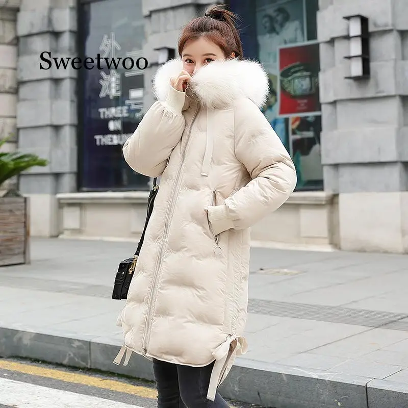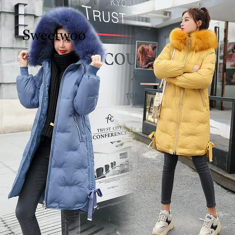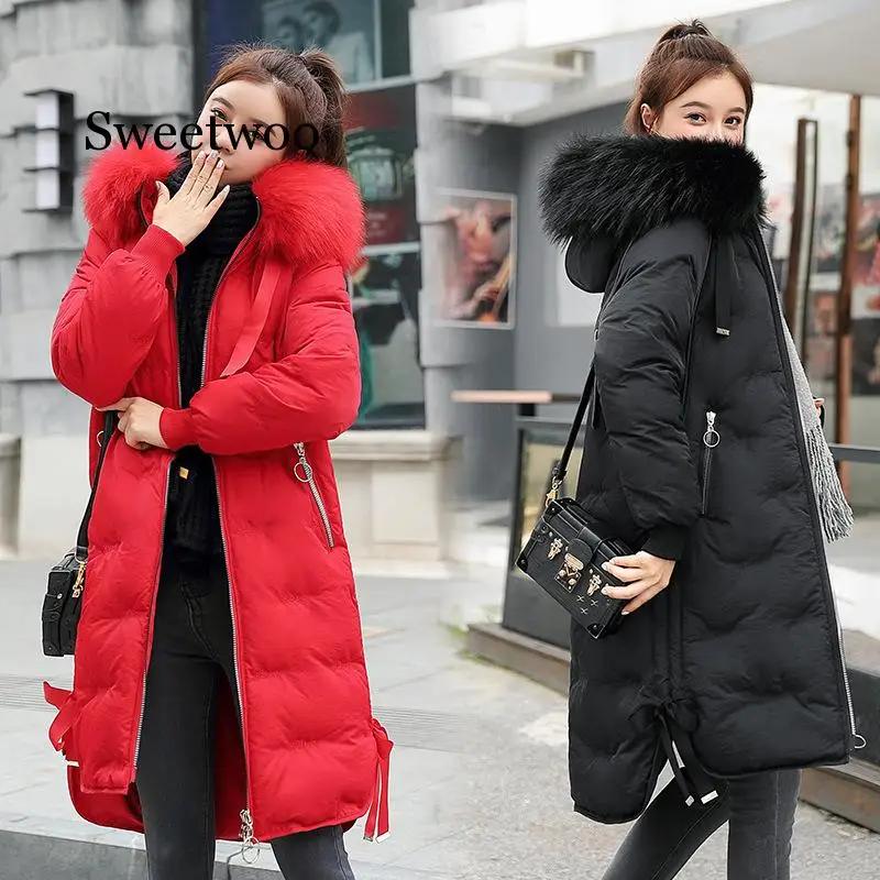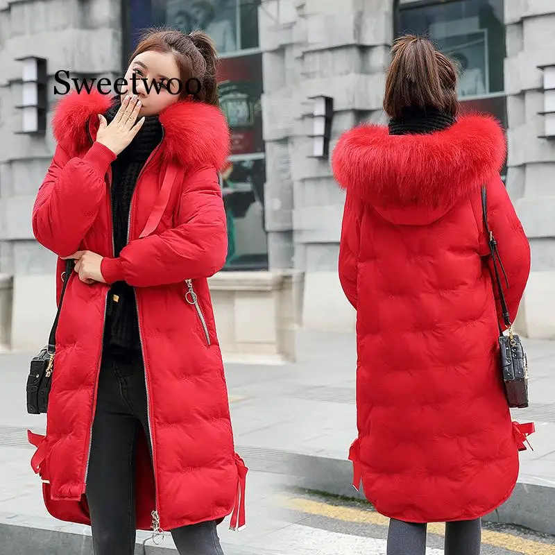 Promo New 2019 High Quality Winter Jacket Women Plus Size Winter Coat Hooded Warm Fur Collar Cotton Padded Long Parkas Women Red Blue