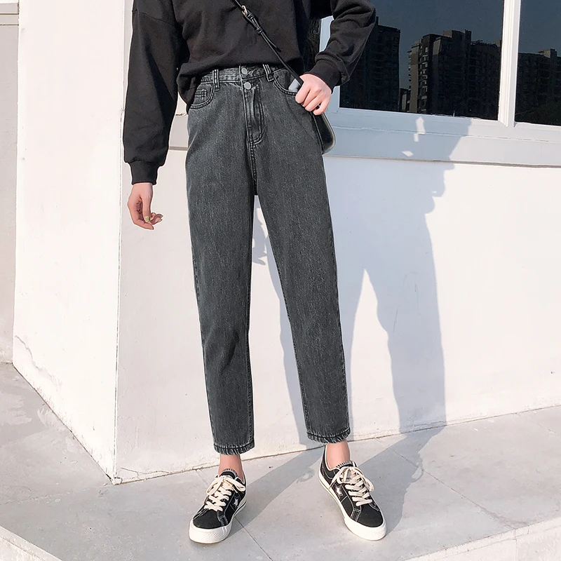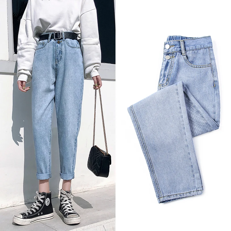 Best Offer Jeans Women Harajuku Solid Button Zipper Fly High Waist Leisure Straight Women's harem cropped pants Lady Trousers Jeans blue