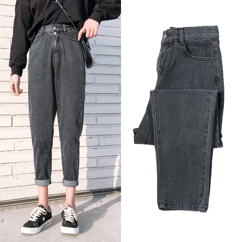 Images of Jeans Women Harajuku Solid Button Zipper Fly High Waist Leisure Straight Women's harem cropped pants Lady Trousers Jeans blue :