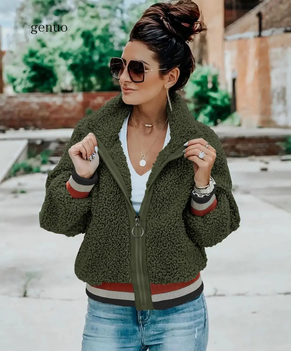 Images of 2020 New Faux Fur Jackets Women Winter Warm High Waist Striped Hem Fashion Slim Army Green Faux Fur Jacket Fake Fleece Coats :