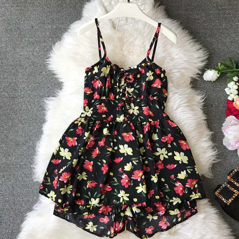 Images of Printed Floral Lace Up Summer Playsuits Retro Daisy Flowers High-waist Suspender Beautiful Chiffon Rompers 2019 summer new :