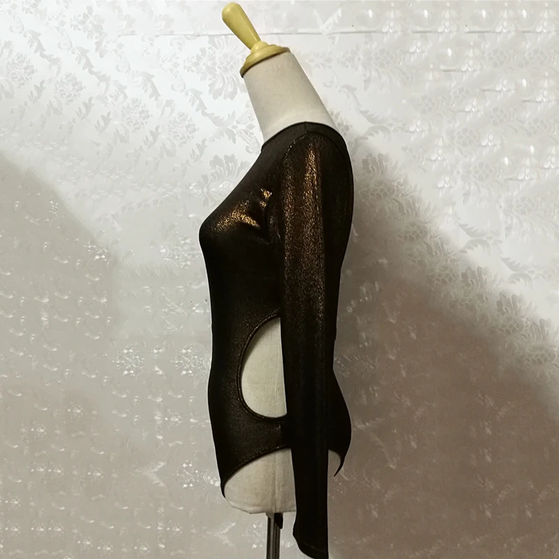 Images of Women Autumn Jumpsuit Slim Gold Silk Hollow Round Neck Solid Color Long Sleeve Sexy Bodysuit Romperse :