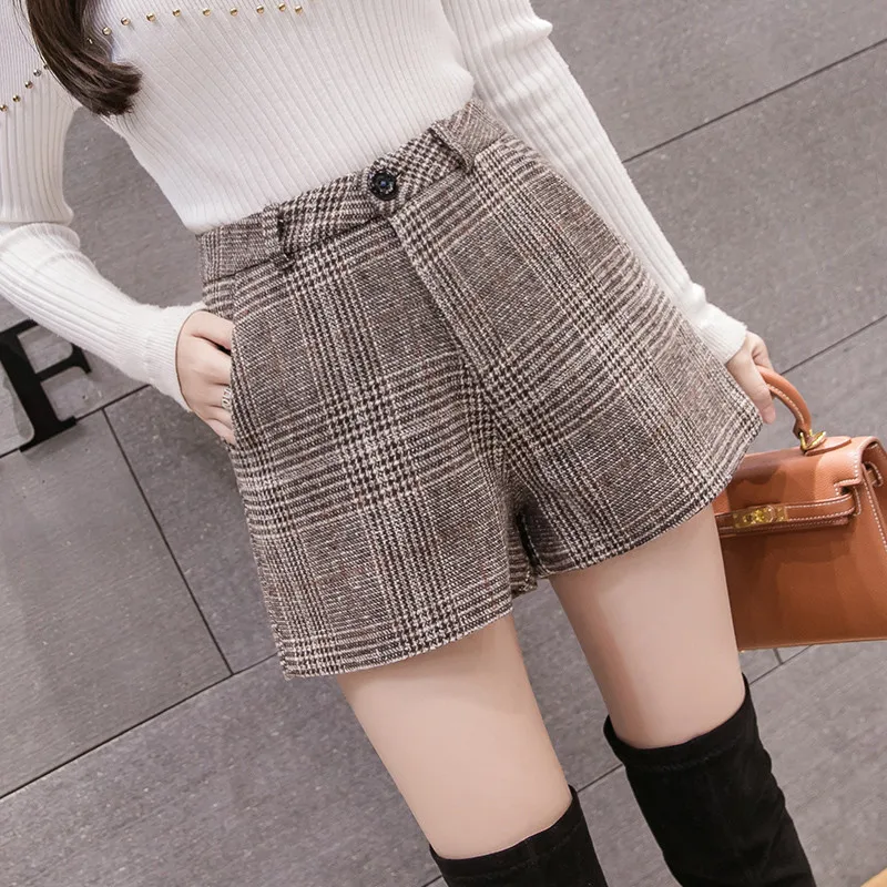 Sale Yellow plaid shorts female autumn and winter models 2019 new Korean version of the loose winter wear wild woolen wide legs