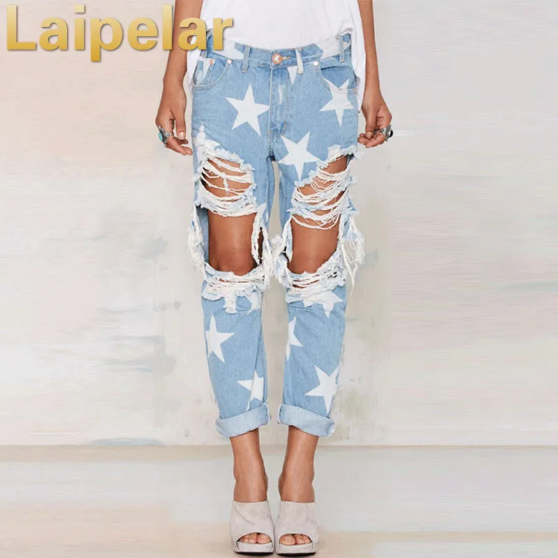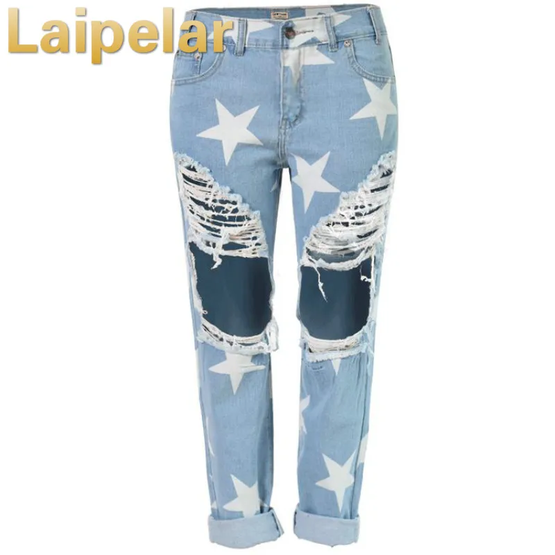 Images of Laipelar 2018 Women Print Five-pointed Star Vintage boyfriend Holes Ripped Jeans Denim Trousers Female Denim Lady Pants :