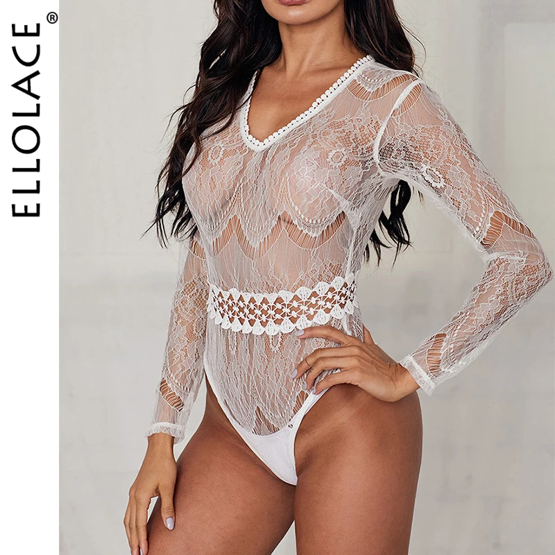Promo Ellolace Sexy Lace Long Sleeve Bodysuit Women Bodycon Transparent Bodys Female Fitness Rompers Lingerie Bodydoll New Wholesale