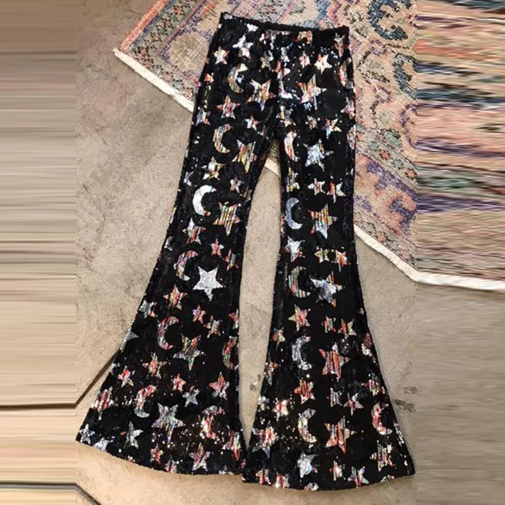 New SEBOWEL Woman's High Waist Elastic Shining Stars Sequined Flare Pants Party New Year Female Sequin Trousers Bell-bottomed Pants