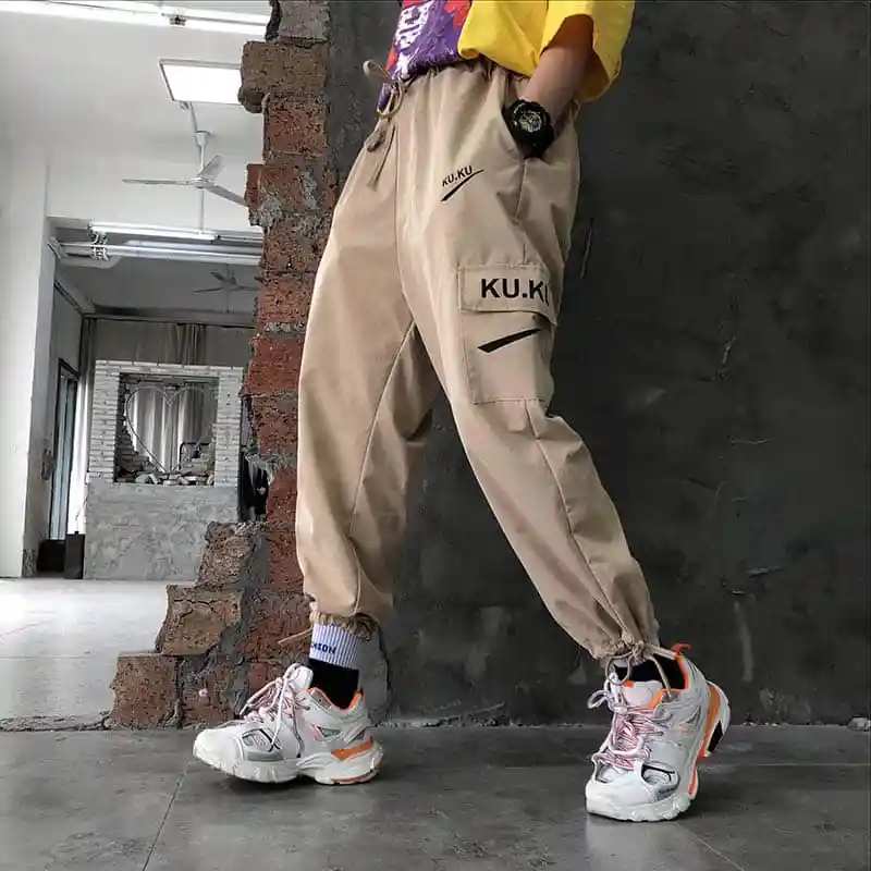 Images of New Fashion Streetwear Ladies Cargo Pants 100% Cotton Women Casual Pants Solid Big Pocket Pants High Waist Loose Female Trousers :